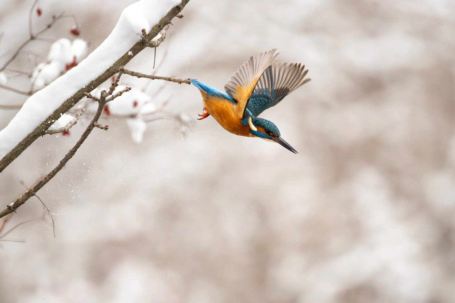 Die Hauptnahrung des Eisvogels besteht aus Kleinfischen von vier bis sieben Zentimetern Länge, ergänzt durch Wasserinsekten, kleine Krebse und Kaulquappen. Die Jagdmethode ist das spektakuläre Stoßtauchen: Von seiner Ansitzwarte aus fixiert der Vogel seine Beute und stürzt dann pfeilschnell kopfüber ins Wasser, um den Fisch mit seinem Schnabel zu ergreifen. Mithilfe einer speziellen Sehfähigkeit kann er die Brechung des Lichts an der Wasseroberfläche kompensieren und die tatsächliche Position des Fisches präzise bestimmen. Nach erfolgreicher Jagd kehrt er auf seine Warte zurück, um den Fisch durch Schlagen auf den Ast zu töten und ihn anschließend mit dem Kopf voran zu verschlingen. Täglich benötigt ein Eisvogel eine beträchtliche Menge an Nahrung, um seinen hohen Energiebedarf zu decken.