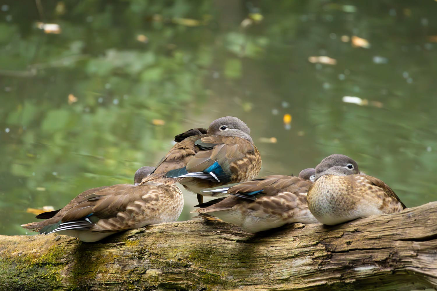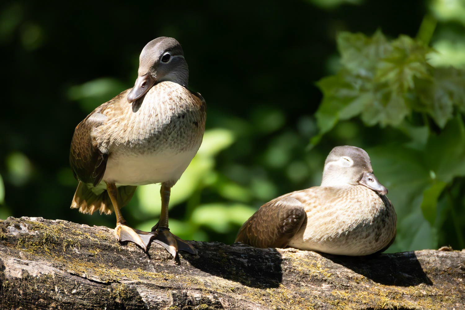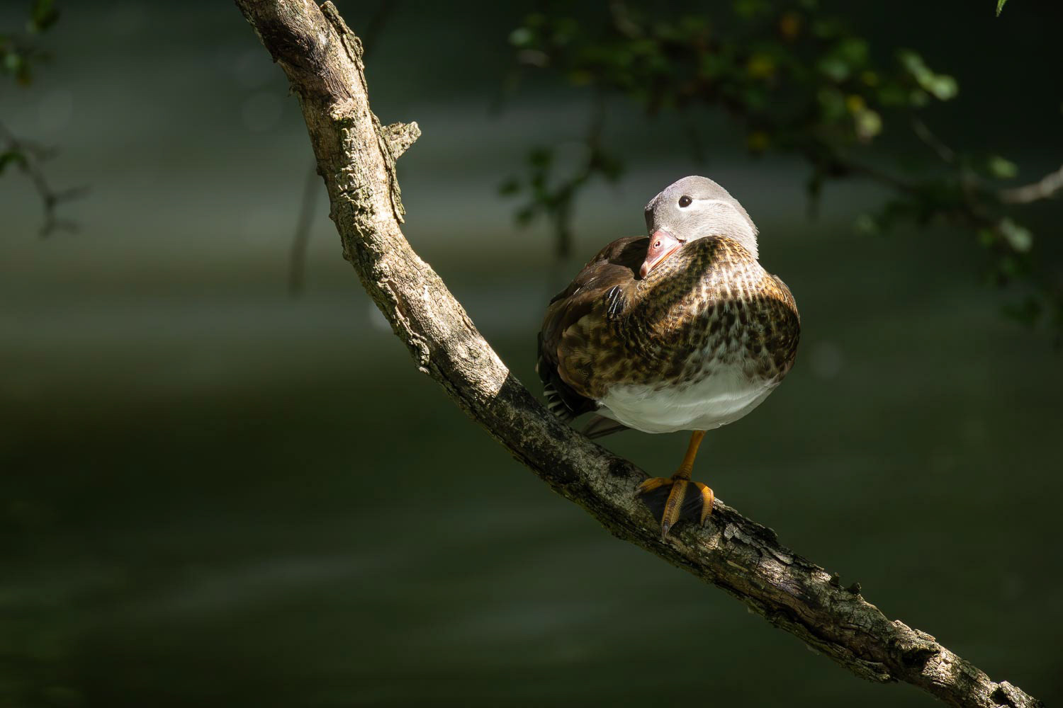 Die weibliche Mandarinente ist deutlich dezenter gefärbt, hauptsächlich in einem matt olivgrauen bis graubraunen Ton, was der Tarnung während der Brutzeit dient. Ihr auffälligstes Merkmal ist der markante, weiße Augenring, der in einen feinen, nach hinten gezogenen Augenstreif übergeht. Ihre Flankenfedern sind weiß oder beige gefleckt, und der Schnabel ist gelblichgrün.