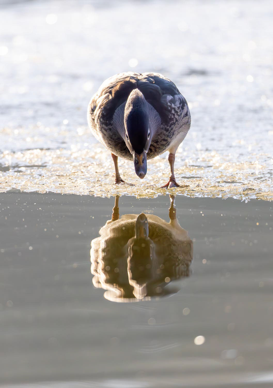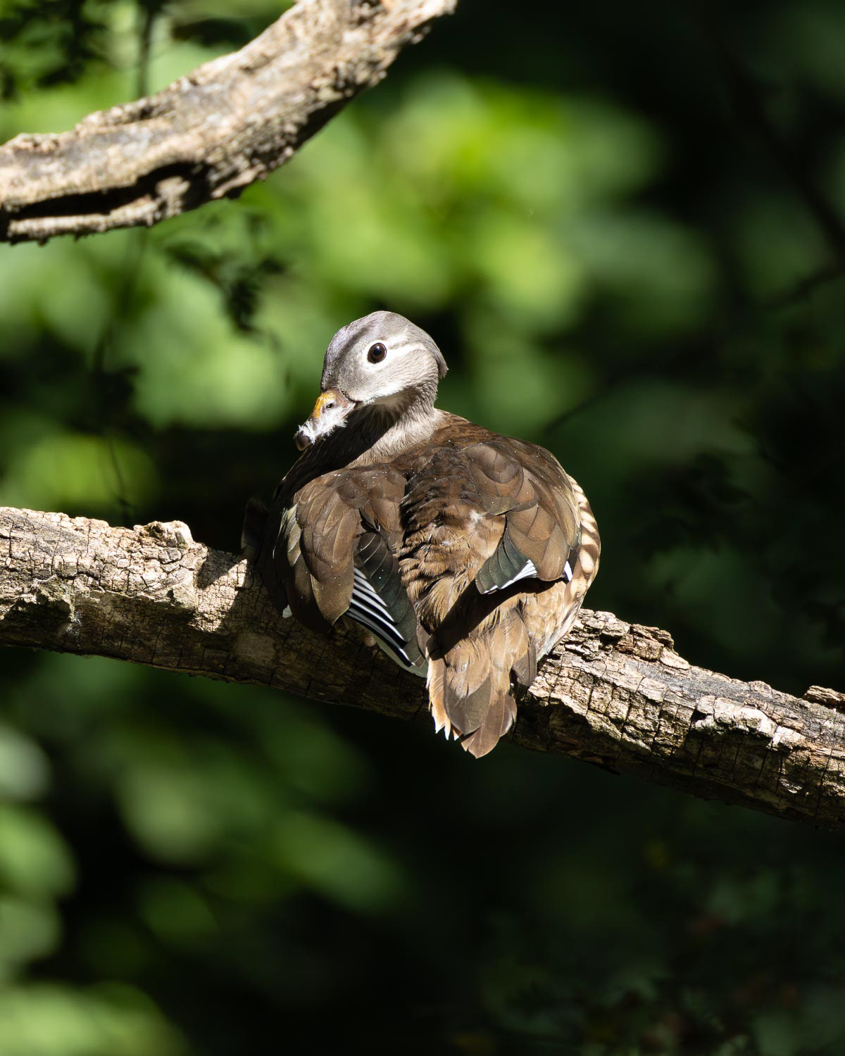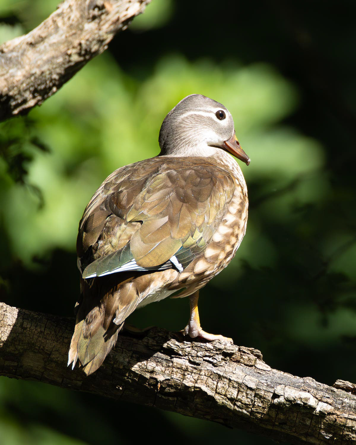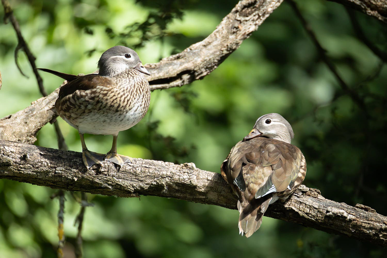 Die weibliche Mandarinente ist deutlich dezenter gefärbt, hauptsächlich in einem matt olivgrauen bis graubraunen Ton, was der Tarnung während der Brutzeit dient. Ihr auffälligstes Merkmal ist der markante, weiße Augenring, der in einen feinen, nach hinten gezogenen Augenstreif übergeht. Ihre Flankenfedern sind weiß oder beige gefleckt, und der Schnabel ist gelblichgrün.