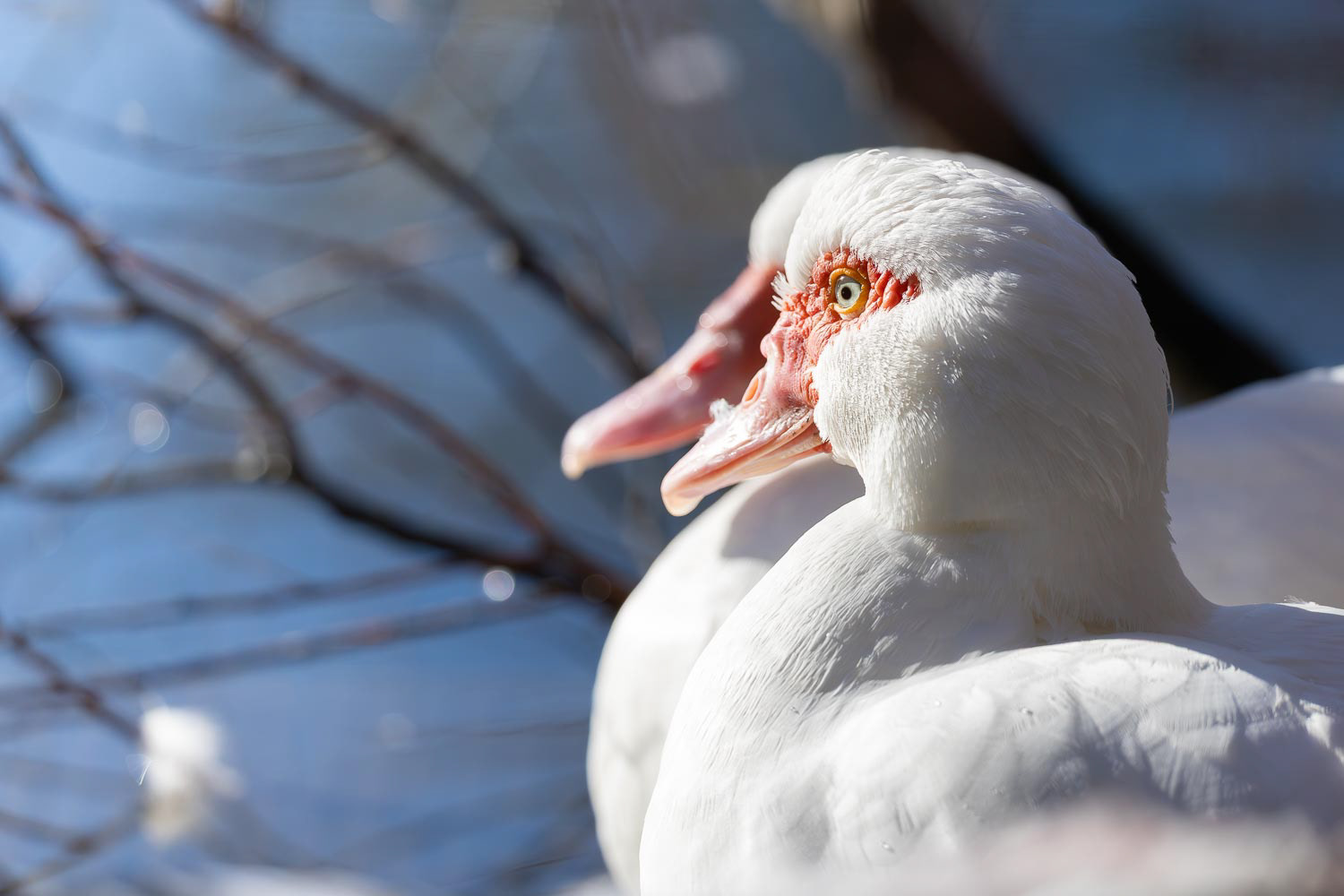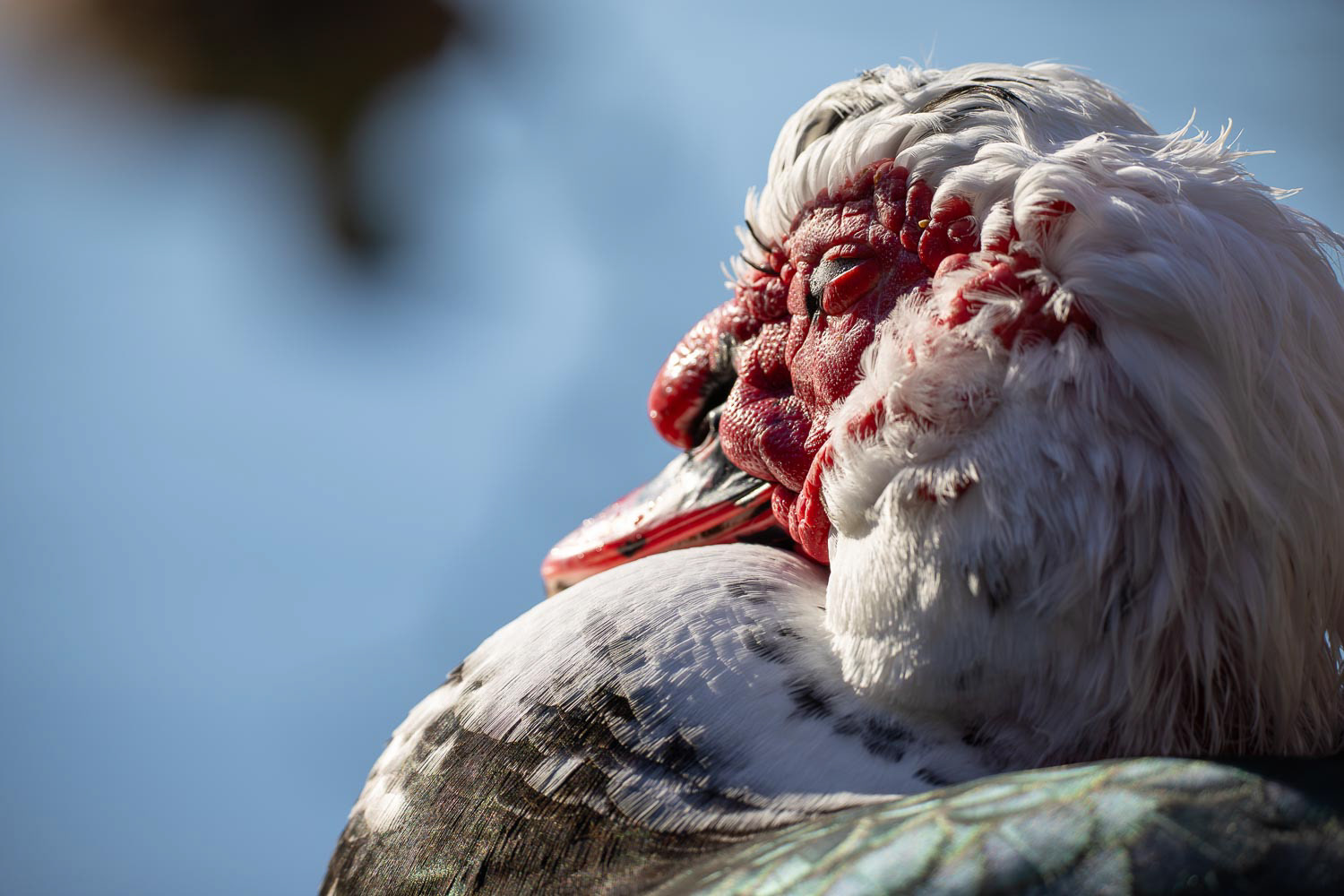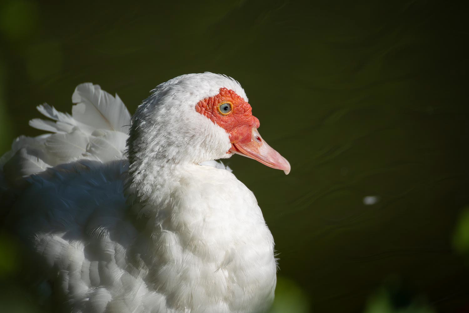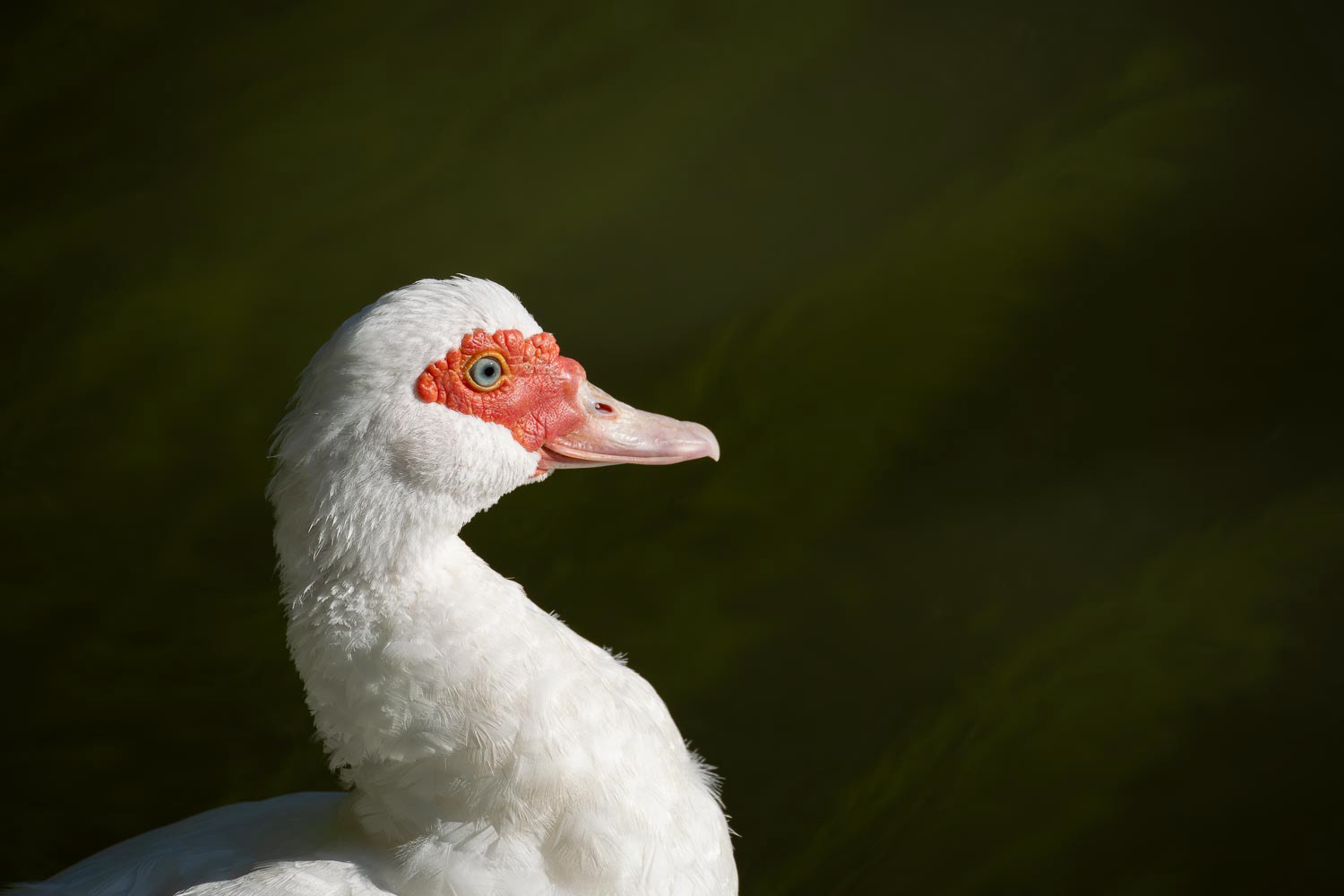 Charakteristisch für die Moschusente, insbesondere für den Erpel, ist das unbefiederte Gesicht, das mit warzenartigen Wülsten, den sogenannten Karunkeln oder Warzen, bedeckt ist. Diese Hautpartien, die auch einen fleischigen Stirnhöcker über dem Schnabel bilden, sind auffällig rot oder schwarz gefärbt und verleihen der Art ihren Beinamen Warzenente. Die Wildform besitzt ein überwiegend dunkelgraues bis fast schwärzliches Gefieder, das in der Sonne metallisch, oft grünlich oder purpurn, schimmert. Die domestizierten Haustierformen sind jedoch in zahlreichen Farbvarianten, von Weiß über Blau bis zu gescheckten Mustern, verbreitet. Die Moschusente gehört zu den eher stillen Wasservögeln, was ihr auch den Namen Stummente eingebracht hat, da sie keine lauten Rufe, sondern höchstens ein leises Zischen von sich gibt.